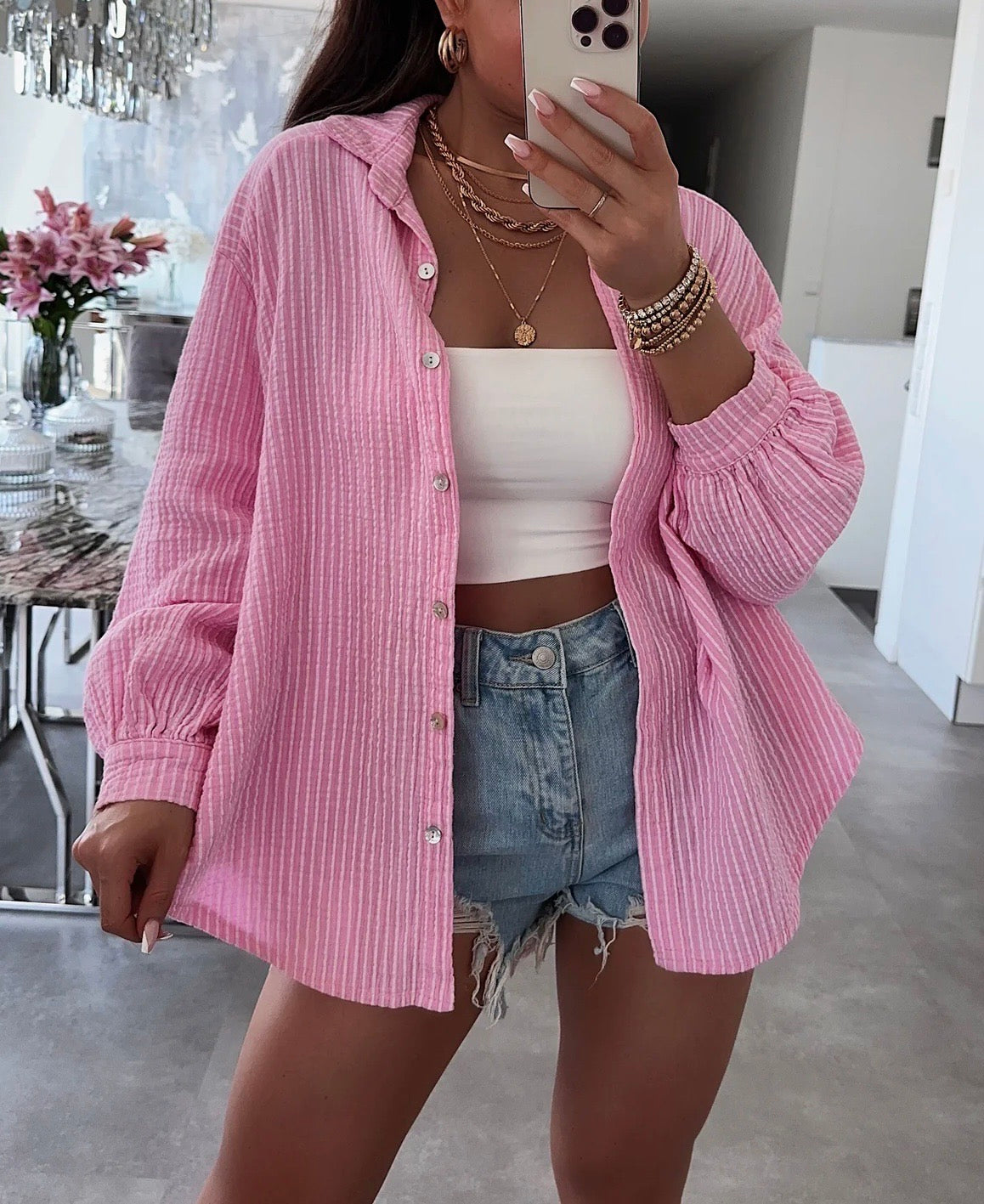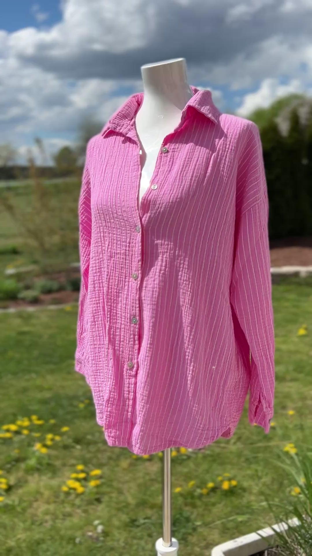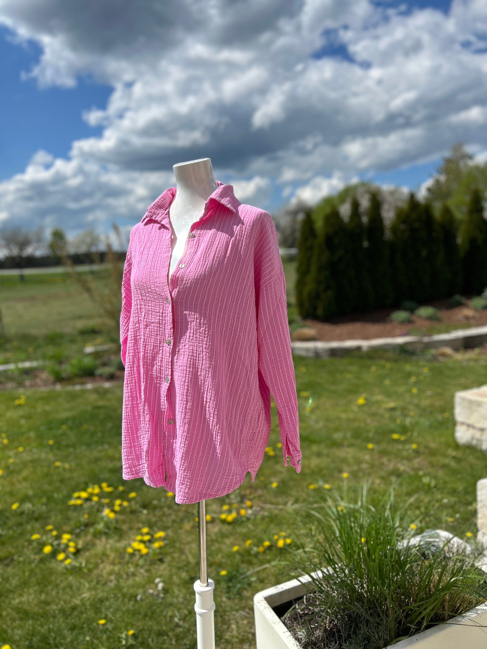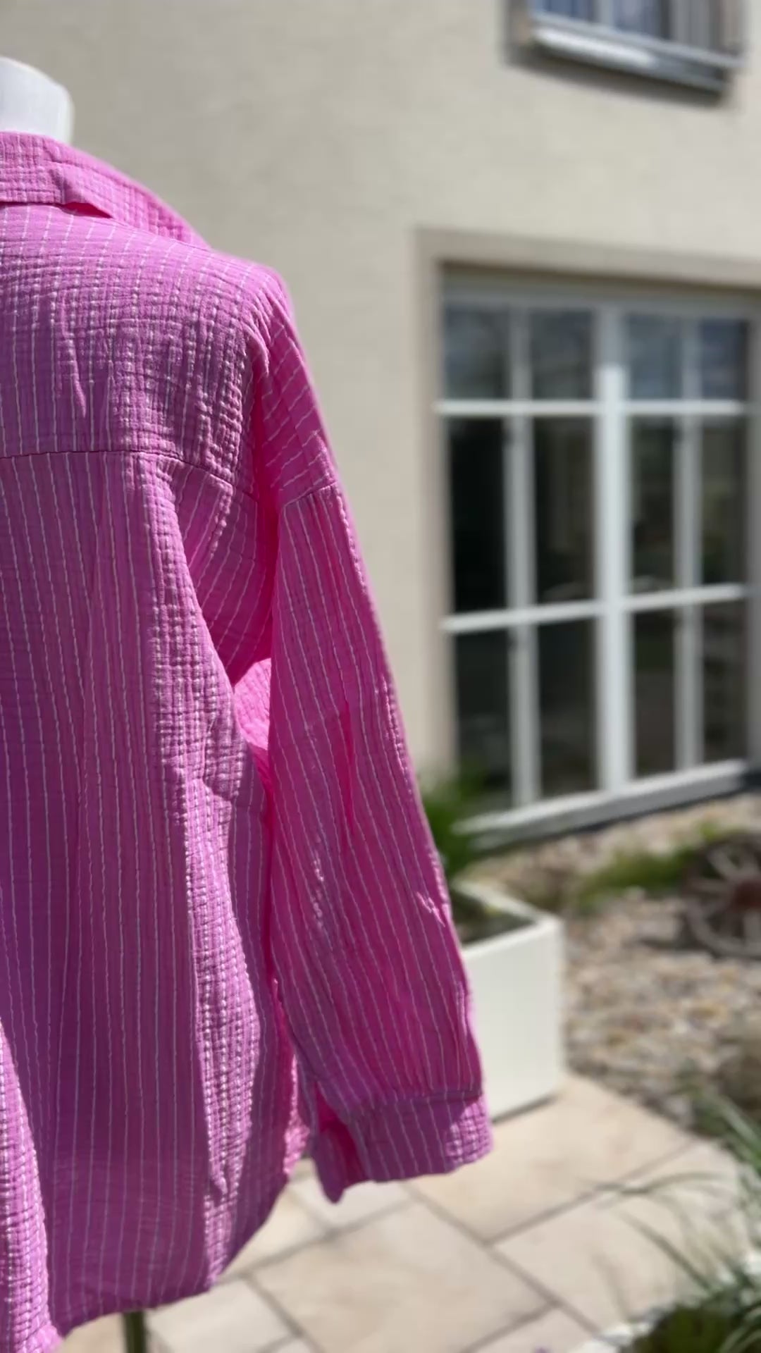 Diese Bluse in zarten Rosa Streifen aus Musselin sorgt für ein leichtes und luftiges Tragegefühl. Der weiche Stoff schmiegt sich sanft an die Haut an und verleiht ein feminines und elegantes Aussehen. Perfekt für den Sommer oder als besonderes Outfit für einen besonderen Anlass.