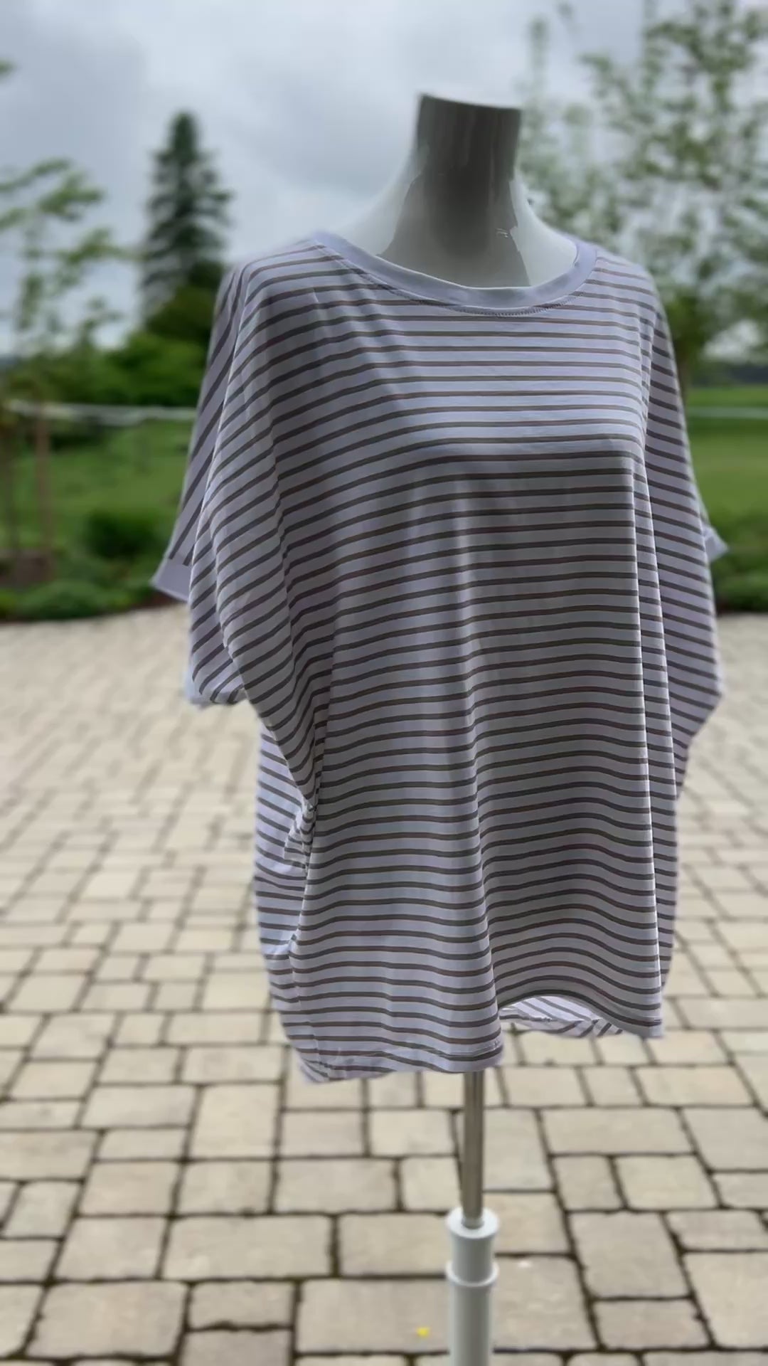 Dieses weiße und beige gestreifte T-Shirt ist perfekt für den Sommer. Dank des leichten Materials eignet es sich für jede Gelegenheit und kann sogar bis Größe 44 getragen werden. Das Oversize-Design sorgt für einen lässigen und trendigen Look. Ein Must-Have für jeden Kleiderschrank!