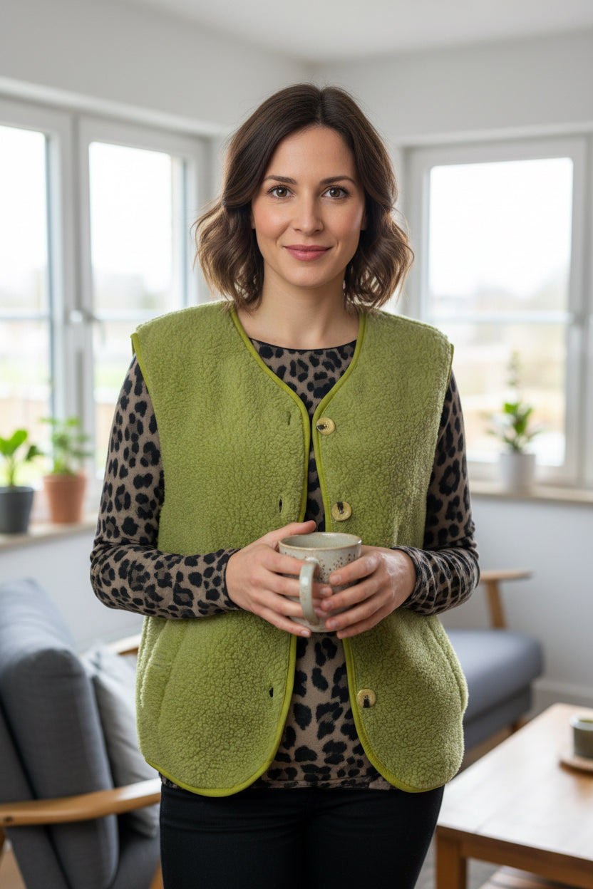 Entdecken Sie den trendigen Teddy Weste in Pistazie. Die Weste besticht durch ihren modernen Look und kuschelweichen Stoff. Perfekt für einen lässigen und stilvollen Auftritt.